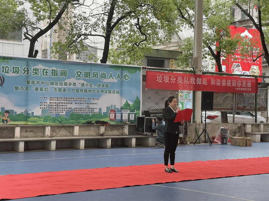10月21日上午,beat365英国官网法学院社工志愿团队于娄星社区协助娄底市创建全国文明城市和国家卫生城市管理工作领导小组办公室、娄底中心城区生活垃圾分类工作领导小组办公室,开展娄星社区中心城区垃圾分类“进小区、进家庭”暨万名“娄底红”垃圾分类志愿督导宣传活动,娄星社区党总支书记周雯艳主持本次活动。