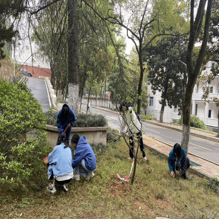 同学们迅速拿好工具赶到指定场所,合理划分男女生打扫区域。同学们戴着手套捡拾草丛里的垃圾,用耙子耙出花坛里的落叶,用扫帚清扫过道,最后一起将垃圾倒入垃圾箱。同学间分工协作,经过半个多小时的努力,整个若谷楼花坛焕然一新。