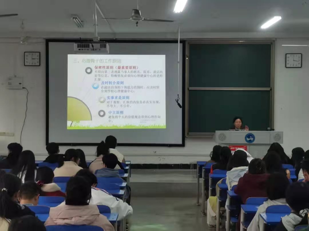 陈玲首先强调了我们需要关注的12种重点人群,然后从朋辈辅导员的工作职责、工作原则和工作技巧三大板块进行详细讲解。陈玲特别强调作为朋辈辅导员,要定期向班主任和辅导员报告本班学生日常心理状况,做到早发现、早沟通、早解决。除此之外,她详细讲述了保密性原则和及时转介原则,并以亲身经历为同学们敲响了警钟。她呼吁各位朋辈辅导员,要注意三种可能发生危机事件的警示通讯,要求发现后要及时去阻止、报告并积极提供帮助。