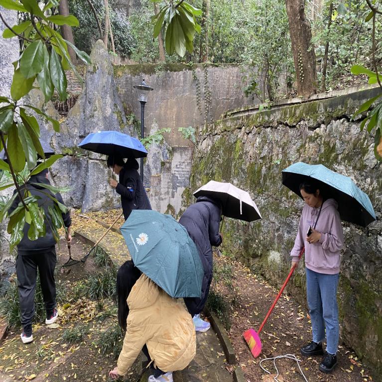 为培养大学生劳育实践意识,11月20日,社工二班于若谷楼旁开展“守望花田”活动。 在团支书的带领下,同学们手持劳动工具迅速到位。尽管下着大雨,全组成员仍是积极性高涨,分散至花坛中的各个区域,用心打扫过道的垃圾和落叶,在草丛隐蔽处捡拾杂物。不出半小时,花坛一角焕然一新。 同学们相互配合,于劳动中感悟团结与责任的力量 ,增强了同学们的责任感与集体荣誉感,塑造了人文校园美丽的一角!