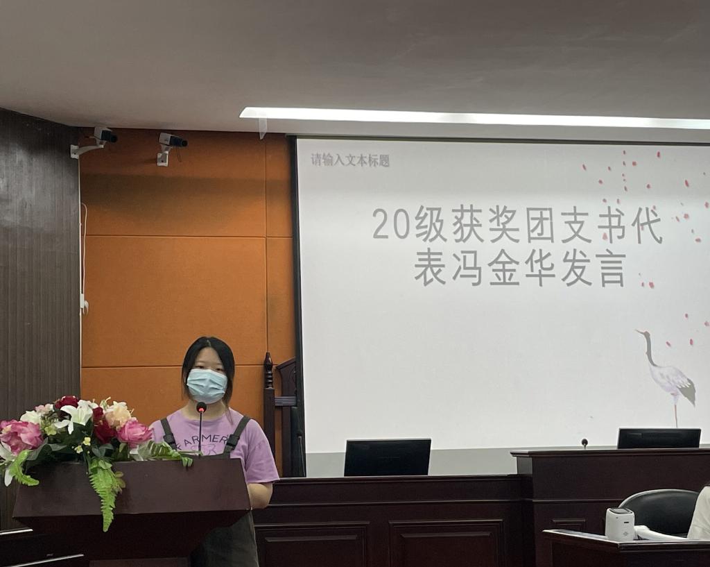 20级获奖团支书代表冯金华上台发言,她分享了“守望花田”的经验并肯定了“守望花田”活动的重要性和必要性,她表示“守望花田”活动不仅可以培养同学们的责任心,同时也可以为同学们营造一个优美的校园环境。