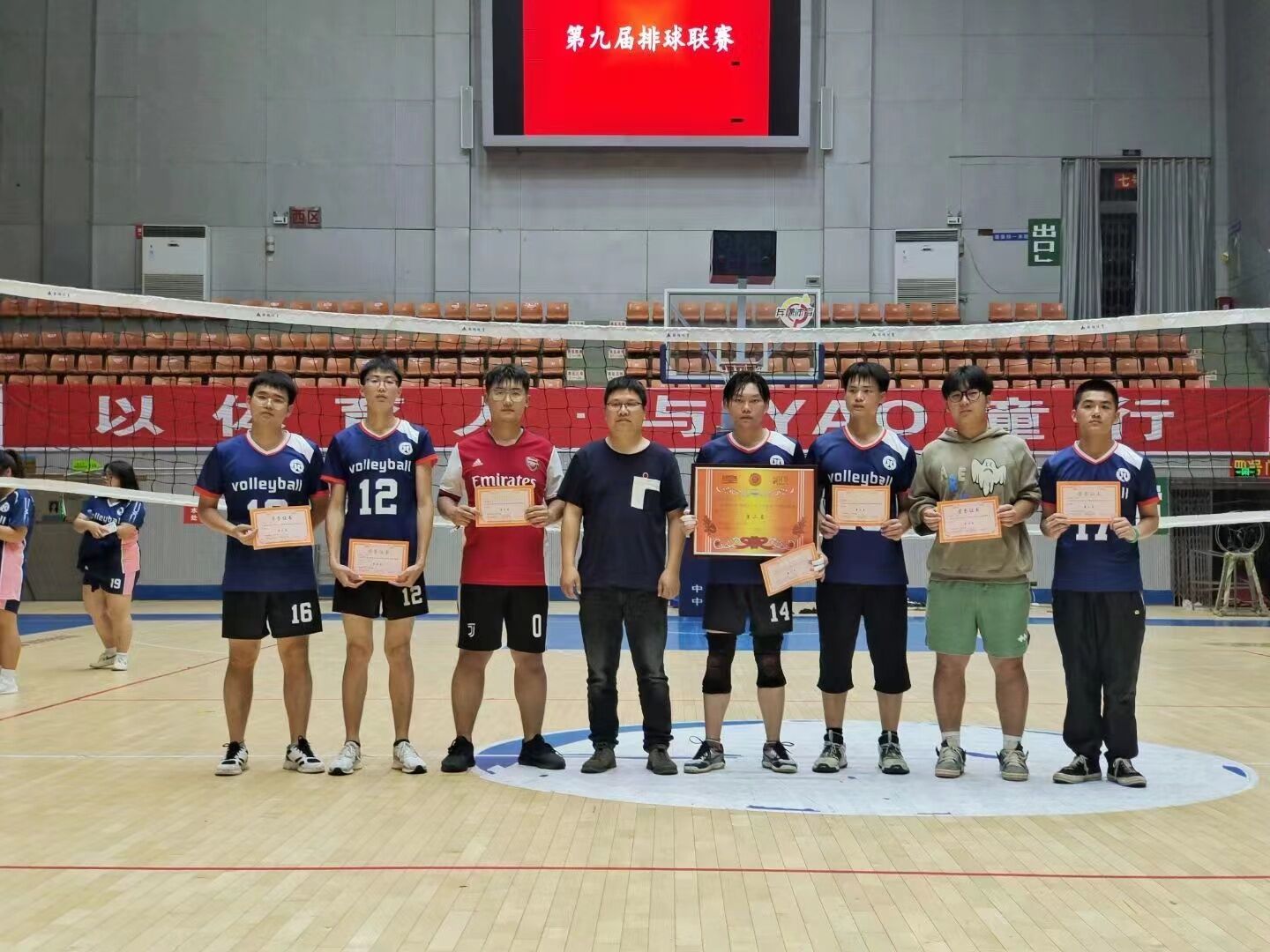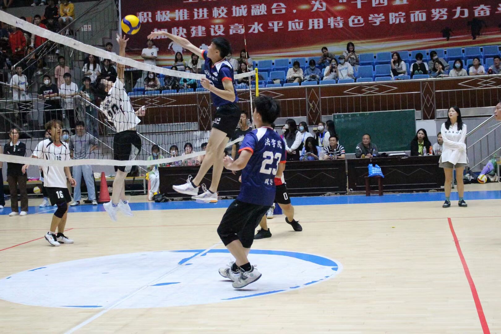紧接着的是男排决赛,法学院对战能机院。比赛中比分胶着攀升,但能机院男排仍略胜一筹。即便如此,法学院男排依旧顽强坚持,最终获得本次比赛的亚军。