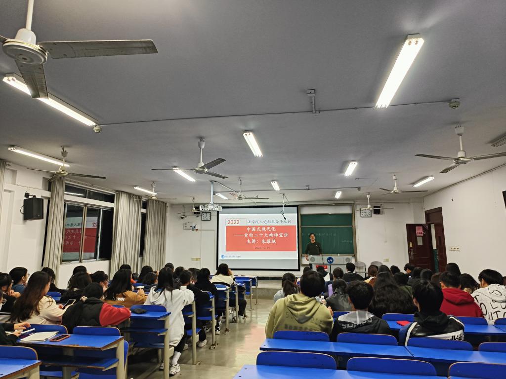 11月19日晚,法学院院长朱耀斌以《学习贯彻党的二十大》为主题,从中国式现代化的目标定位、历史演进、历史特点与基本规律和中国式现代化四个方面展开讲述。入党学员必须明确全面建成社会主义现代化强国,实现第二个百年奋斗目标,以中国式现代化全面推进中华民族伟大复兴的目标定位,了解中国现代化的历史进程。