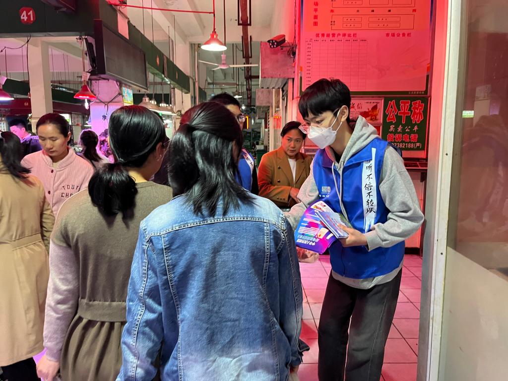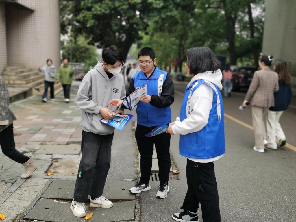 朱耀斌和刘景春莅临校外主会场,指导青年志愿者们参与并配合会场工作人员进行维持秩序、发放宣传单和奖券、引导演员等工作。同时,法学院的同学们为反诈宣传活动献上了一场充满活力与青春的舞蹈节目——《舞动青春》。校外分会场由辅导员羊哲思和袁嘉炜带队,分别对早元社区和三元社区的群众进行面对面防诈常识的普及、上门帮助群众安装国家反诈APP 、引导群众到主会场参加活动,进行进一步的全民反诈宣传。在beat365英国官网分会场中,同学们通过摆点宣传、派发传单、讲述相关案例等方式同步开展防诈骗知识的宣传。