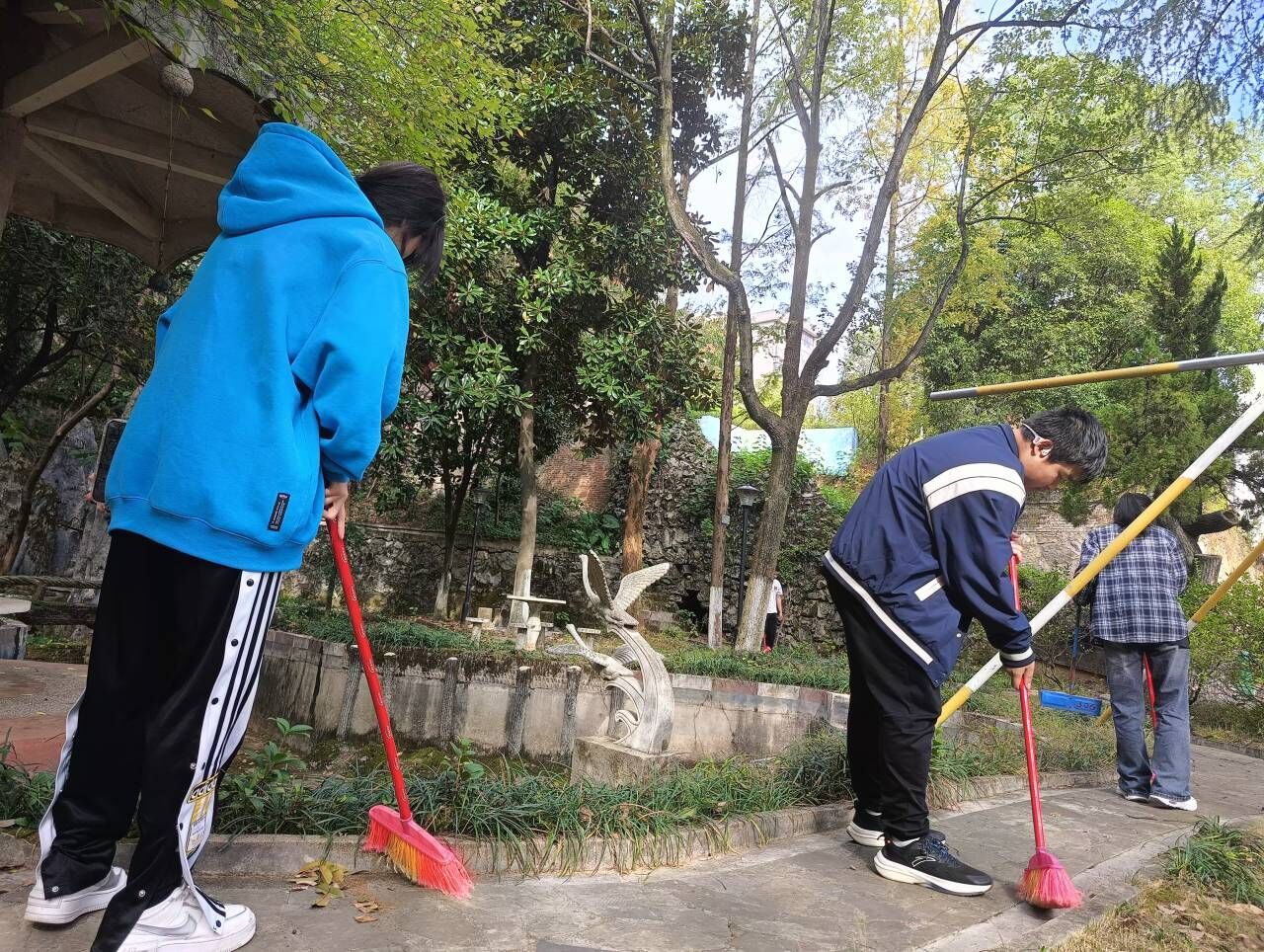 同学们分工有序,有的清扫地面,有的打扫花坛。地面上落叶繁多,但同学们不厌其烦,一遍又一遍的打扫,决心让校园恢复它原本的整洁与美好。同学们用自己的热情和专注,清理杂草,修剪花枝,用自己的双手和智慧守望这片花田。