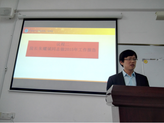 会上,书记谢光绎同志致开幕词,院长朱耀斌教授向大会作2015年法学院工作报告,工会主席刘依归老师向大会作工会工作报告。大会对以上报告及《法学院院务公开制度》、《法学院目标管理二次分配实施方案》进行了分组讨论,与会人员积极参与,认真审阅,对报告和文件提出了宝贵修改意见。