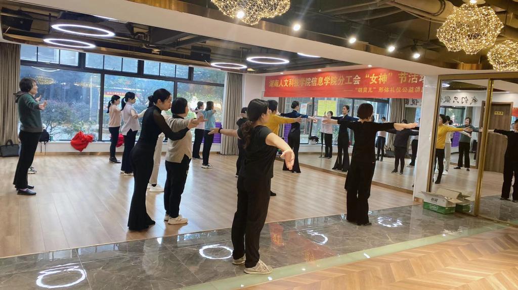 内修心,外修行,美在形体,雅在仪态。经院分工会的努力争取,在“胡贝儿”形体礼仪女子学堂星海名都校区的大力支持下,信息学院分工会的女神们在“女神”节这一天来到了“胡贝儿”形体礼仪女子学堂星海名都校区体验形体礼仪课。