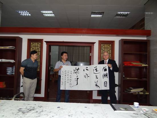 访问期间,约翰斐莱斯校长一行在beat365校长郭军、副校长石潇纯等领导的陪同下兴致勃勃参观了学校美术系与娄底书画院共同举办的产学研合作基地,客人对基地展示的非物质文化遗产和美术系师生的书法作品表示了浓厚兴趣,美术系老师、全国书法家协会会员易俊当场写下:“有朋至远方来,不及乐乎”条幅赠送客人。