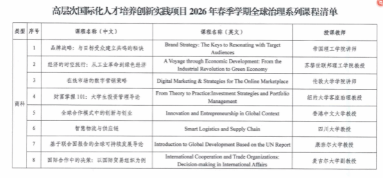 项目包括全球治理课程、国际公务员职业生涯规划讲座、创新科研训练和赴国际组织或知名企业实习实训等方面内容。根据项目安排,“2026年春季全球治理线上课程”将继续邀请来自牛津大学、康奈尔大学、伦敦大学学院等海外知名院校,及清华大学、香港中文大学等国家一流大学教授/讲师线上授课;全校共50个名额,课程费用由学校全额资助,学习成绩可折抵公选课学分,成绩优异者可申请国际组织或知名企业实习实训资格。