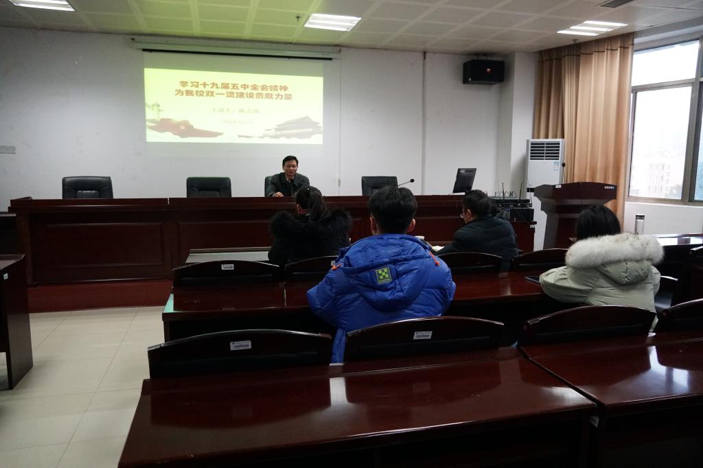 陈副校长从十九届五中全会召开的重大意义与背景、全会主要成果、《建议》逻辑主线与主题、《建议》突出特点和突出亮点、《建议》、《公报》内容要点、核心要义等方面对党的十九届五中全会精神进行了深入解读。