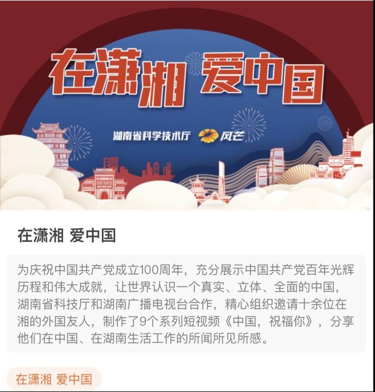 2021年是中国共产党成立的一百周年,为展示中国共产党百年光辉历程和伟大成就,让世界认识一个真实、立体、全面的中国,湖南省科技厅与湖南广播电台为庆祝百年建党,邀请十余位外国友人打造了名为《中国,祝福你》的9个系列短视频,分享他们在中国、在湖南生活工作的所闻所见所感。