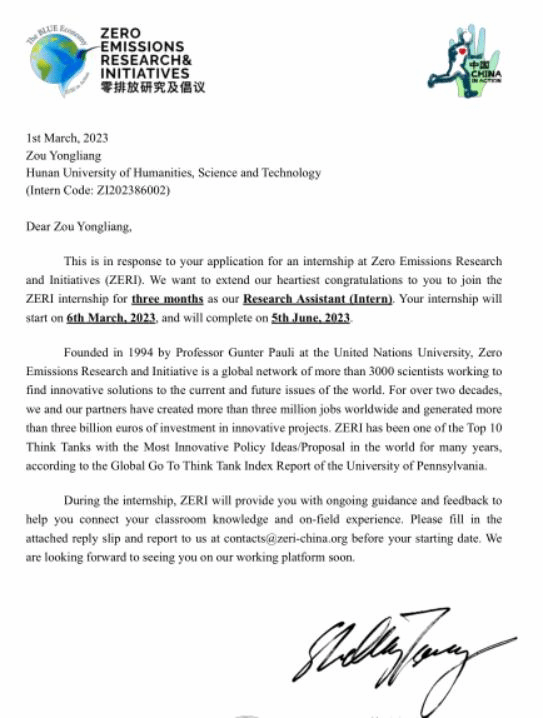 3月1日,beat3652019级文学院秘书学专业学生邹永亮收到国际组织“零排放研究及倡议(ZERI)”研究助理实习岗位的录取通知。此次邹永亮同学在全国百余位候选人中脱颖而出,成为beat365在校学生中获得国际组织实习offer的第一人,也是学校“开放扬校”工程和国际化人才培养的重要进展。