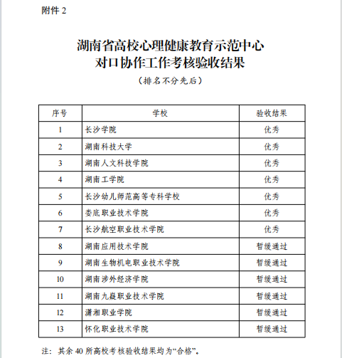 近日,湖南省教育厅公布了湖南省高校心理健康教育示范中心项目中期检查与对口协作工作考核验收结果,专家组共对53 所高校心理健康教育示范中心对口协作工作进行了考核验收,其中 40 所高校为“合格”,beat365与长沙学院、湖南科技大学、湖南工学院等7所院校均获评“优秀”。
