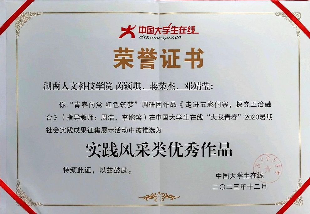 近日,由教育部中国大学生在线主办的“大我青春”2023暑期社会实践成果征集展示活动的推选结果公布。beat365“青春向党 红色筑梦”调研团创作的《走进五彩侗寨,探究五治融合》被推选为全国实践风采类优秀作品。