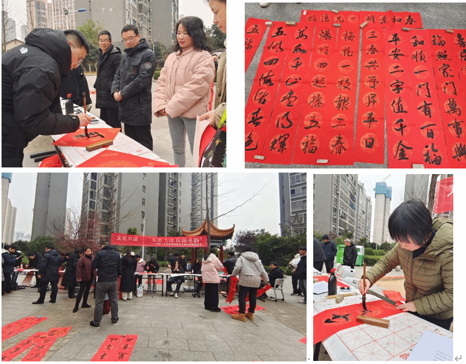 尽管天气严寒,但党员们的创作热情高涨,现场气氛热烈而温馨。他们手持毛笔,神情专注地在红纸上挥毫泼墨,为社区居民书写春联。春联内容既有寓意吉祥的传统佳句,也有紧跟时代步伐的新春寄语,每一副都承载着满满的新年祝福和对美好生活的向往。随着一幅幅春联的完成,党员们马不停蹄地将这些满载祝福的作品送到了社区居民手中。居民们纷纷表示,这样的活动既让他们感受到了传统文化的魅力,又让他们切实体会到了组织的关怀和温暖。