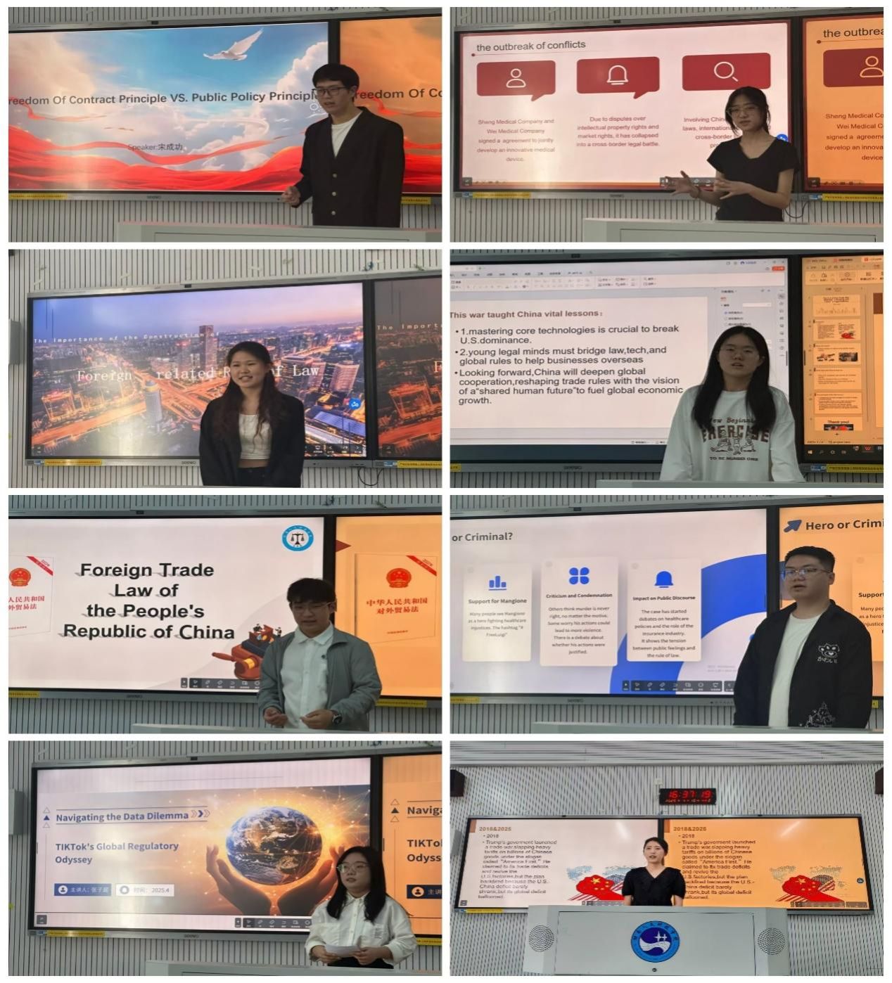 4月12日,所有参赛选手在致远楼208教室参加了笔试。4月15日,法学院在致远楼208教室开展了本次大赛面试演讲环节的比赛。院长朱耀斌首先说明了举办本次大赛的目的,并勉励参赛选手们珍惜机会,以赛促学,以学促用,为将来成长为涉外法治人才奠定坚实基础。法学院副教授谢常红老师、王演兵博士、刘小林老师 担任面试环节评委。本轮面试是对选手法学专业知识和涉外法治综合素养的综合检验,选手们围绕涉外法治热点问题做了精彩纷呈的主题演讲,比赛现场气氛紧张有序。三位评委老师依据演讲内容、语言表达、形象风度等方面进行综合评分。