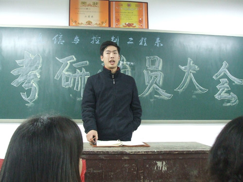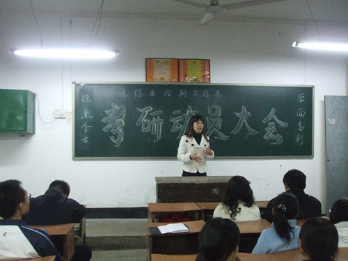 会议由谭甲凡副主任主持,考研班班主任方智文、教师代表周桃云介绍了考研的经验,考研班班长陈军代表入选考研班的47名同学同学表明了决心,立志努力拼搏、坚持不懈,迎接人生新的挑战。系主任成运教授、博士勉励学生要有志在必得的决心和勇气,并为之努力奋斗,要有淡泊明志、能经受各种干扰和诱惑、能耐得住寂寞的能力,这样,考研的理想将一定会实现。