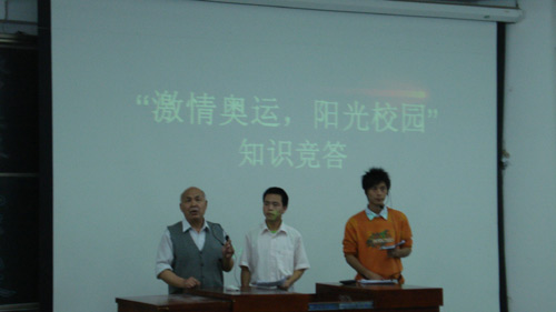 5月9日晚7:00,化学与材料科学系团总支在教学楼5栋102室举行了以“激情奥运,阳光校园”为主题的奥运知识竞答赛。院关工委常务副主任张特世、化学与材料科学系党总支书记余为等领导亲临赛场指导,并由院关工委张特世同志致开幕辞。