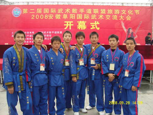 为了弘扬中华武术,为国内外高水平武术运动员提供武术交流平台,由国际武术散手道联盟主办,中国散手道协会、阜阳市体育局承办的第二届国际散手道武术大赛于2008年9月30日在安徽阜阳市体育馆圆满落下帷幕,此次大赛有来自美国、加拿大、俄罗斯及中国等12个国家的1048名运动员参赛,beat365武术队10名选手在领队彭健民主任的带领下,在武术教学团队杨俊军、周惠新、梁正军、陈勤、杨志华等老师的辛勤指导下,通过两年的艰苦训练,参加了竞技太极推手、传统武术劈挂拳等项目的比赛。