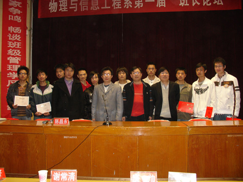 3月31日下午2:30,物理与信息工程系第一届“班长论坛”在图书馆报告厅举行。论坛由该系主任陈昌永教授主持,校学工处处长谢光绎、系党总支书记谢常清及全系老师作为嘉宾应邀出席,06级到08级的各班同学参加了本次论坛。本次活动由物理系学生会、团总支共同举办。