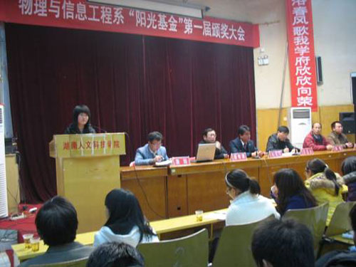 12月22日晚,物理与信息工程系在图书馆报告厅举行了“阳光”基金奖学金颁奖典礼,校长柏连阳及科研处处长陈昌永和物理系领导出席了会议,该系宋彩霞、黄舜尧、聂双金三位同学获得了首届“阳光”奖学金。