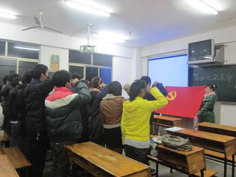 谭书记在讲话中重申了“创先争优”活动的意义,说明了示范党支部建设的标准,肯定了自动化支部党员一直以来的表现,并对自动化支部党员提出了更高的要求。随后,自动化支部全体党员在组织委员徐浩的带领下,面向党旗,举起右手,重温了入党誓词。