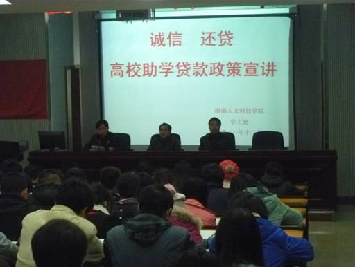 晚,学工处在美术系报告厅组织召开了以“诚信还贷”为主题的高校助学贷款政策宣讲大会。学工处副处长周邦春主持会议,学工处处长刘铁峰、助管科科长段文武、各系分管学生助学贷款工作的辅导员以及2012届毕业班贷款学生参加了这次会议。