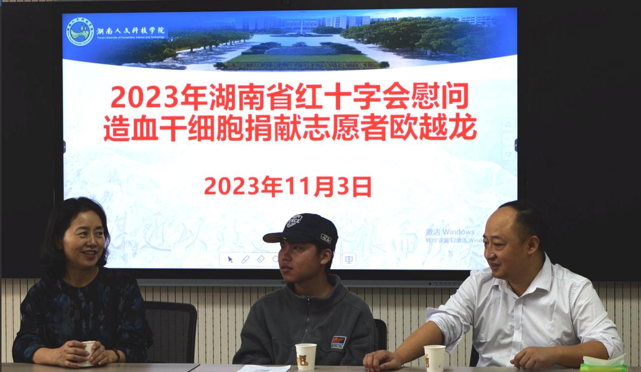 为大力弘扬红十字会“人道、博爱、奉献”的精神,11月3日上午,湖南省红十字会来beat365慰问造血干细胞捐献志愿者欧越龙同学。湖南省红十字会党组成员、副会长邱梦丹,湖南省造血干细胞捐献者资料库管理中心主任张赞、湖南省造血干细胞管理中心卓林悤,市红十字会党组成员、副会长李林华,市红十字会秘书长刘鸥,娄星区常务副会长严希、副会长熊艳,校友办主任刘莉、校团委副书记刘佳、美术与设计学院副书记成伟及有关师生代表参加。