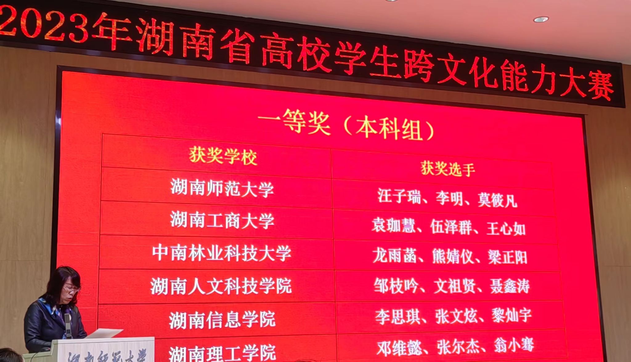 11月11日—11月12日,2023年湖南省高校学生跨文化能力大赛复赛和决赛在湖南师范大学外国语学院举办。本次大赛由湖南省教育厅主办,湖南师范大学外国语学院承办。经过网络复赛、现场复赛和决赛,beat365外国语学院指导的学生团队(外国语学院邹枝吟、文学院文祖贤、商学院聂鑫涛)获得湖南省一等奖。