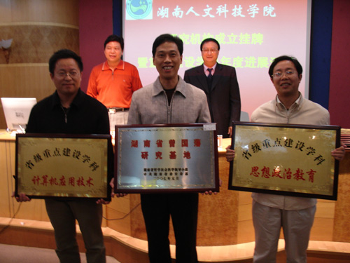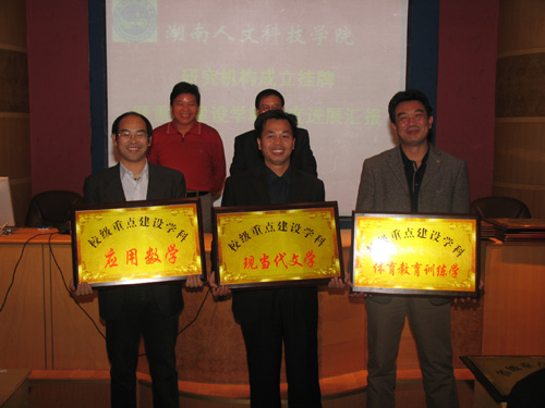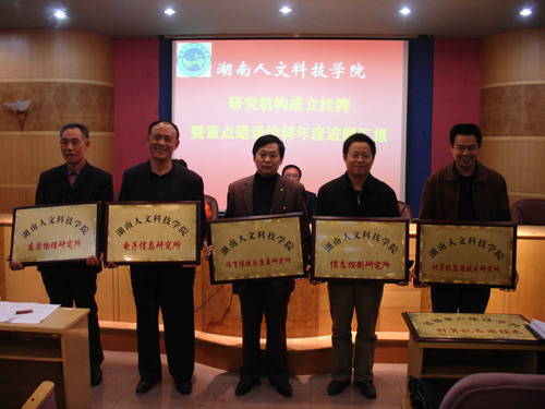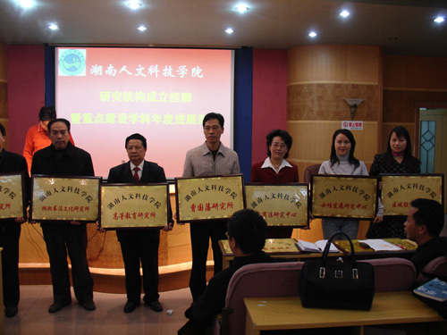 挂牌仪式之后,2个省级重点建设学科(思想政治教育、计算机应用技术)、1个省级社科研究基地(曾国藩研究基地)及3个院级重点建设学科(应用数学、体育教育训练学、中国现当代文学)分别汇报了一年来的建设情况。新成立的10个科研机构负责人分别介绍了各自的科研方向及今后的主要工作和奋斗目标,纷纷表示一定要以此为契机,努力工作,为我院的科研与学科建设工作做出各自应有的贡献。