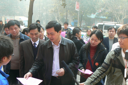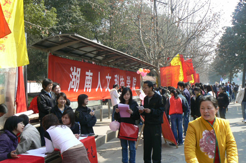 3月1日上午8:00,由院团委组织的“参与志愿服务、建设两型社会”“三·五”学雷锋活动在春园步行街隆重拉开序幕。团省委副书记颜海林同志、团省委办公室主任李华军同志在市人大副主任刘波、市政协副主席李海江、团市委康艳华书记、我院院长助理刘铁铭教授、团委副书记周海强、谢柳及各系分管团工作的领导的陪同下,莅临现场指导工作。