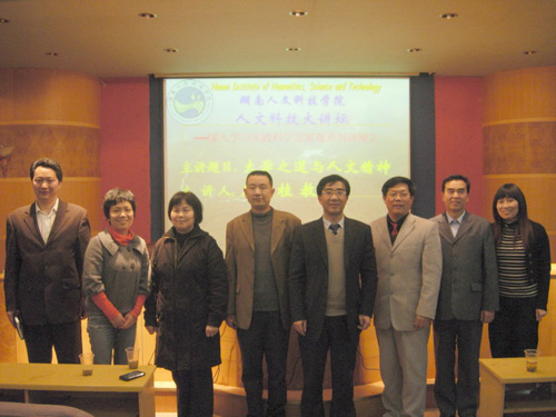 为深入学习实践科学发展观,加快学校内涵建设,提升学校办学水平,促进人文与科技的融合,2009年4月7日晚上7:30,beat365周兰桂教授在现代教育技术大楼多功体报告厅做了题为《大学之道与人文精神》的学术讲座。讲座由宣传统战部副部长肖双荣主持。院长助理蒋建初应邀出席讲座。参加讲座的有中国民主同盟娄底市委秘书长羊小庆、办公室主任王红贵同志,中国民主同盟beat365英国官网支部全体盟员以及学校中文系、教育系、外语系、计算机系和通控系等200多名师生。