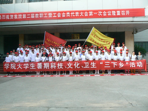 2009年7月12日早晨8:00,beat365暑期科技、文化、卫生“三下乡”社会实践活动出征仪式在校办公楼前坪隆重举行,来自学校15个系部的80多名青年志愿者组成了双峰农村服务队、社区服务队、湘潭经济调研队。院长助理刘铁铭以及院团委、学工处、思政部的领导和老师出席出征仪式。