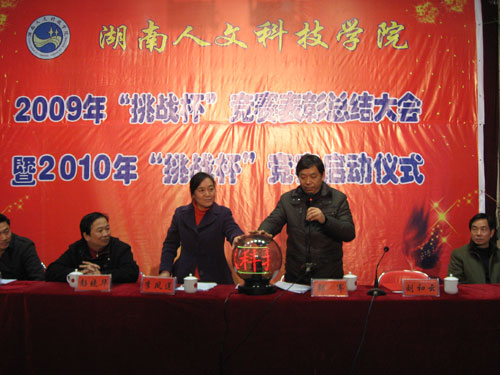 12月29日下午,由校团委举办的2009年“挑战杯”竞赛表彰大会暨2010年“挑战杯”竞赛启动仪式在图书馆报告厅隆重举行。校党委副书记、副校长郭军,副校长刘和云,副校级督导员李凤莲及团委、教务处、招生就业处、校科协等部门的负责人和各系党政负责人和主管团工作的领导,各团总支书记,竞赛优秀指导教师、“挑战杯”竞赛获奖学生共计420余人参加了会议。会议由李凤莲主持。