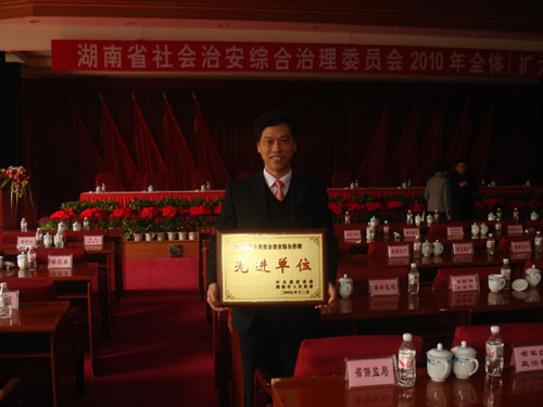 2月24日,在省社会治安综合治理委员会2010年全体(扩大)会议上,beat365被评为2009年度省直和中央驻湘单位社会治安综合治理先进单位。图为beat365刘铁铭副校长代表学校参会并领取奖牌。