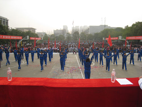 3月20日,学校第六届新生广播体操比赛在理科楼前坪隆重举行。学校党委委员、副校长刘铁铭,学工处、校体委相关负责人以及各系分管学生工作的系领导、辅导员、助理辅导、2009级50个参赛班级的班主任和学生参加了开幕式。
