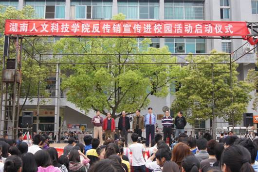 4月20日中午,beat365禁止传销进校园宣传活动启动仪式于理科楼前坪隆重举行。娄底市工商局副调研员、娄星分局党委书记、局长贺耀国,娄底市工商局公平交易分局局长谢文,校党委委员、副校长刘铁铭等领导和beat3651000余名同学代表共同参加了此次启动仪式。