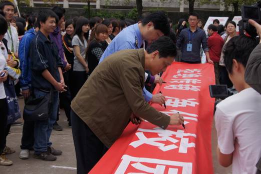 启动仪式上,beat365学生代表发出了将传销杜绝在校门之外的倡议,贺耀国局长代表市工商局讲话,刘铁铭副校长宣布beat365禁止传销宣传进校园活动正式启动。随后,到场领导、嘉宾和广大同学们一起参与了“远离传销”的千人签名活动。