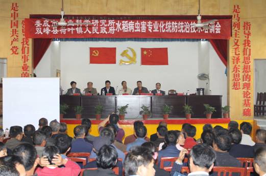 4月23日beat365英国官网农科所水稻病虫害专业化统防统治技术培训会在双峰县荷叶镇隆重召开。beat365农科所、科技处,市委农村工作部,市农民素质教育办公室,双峰县委组织部,双峰县农业局、财政局、农机培训学校等单位的相关负责人和专业技术人员出席会议。