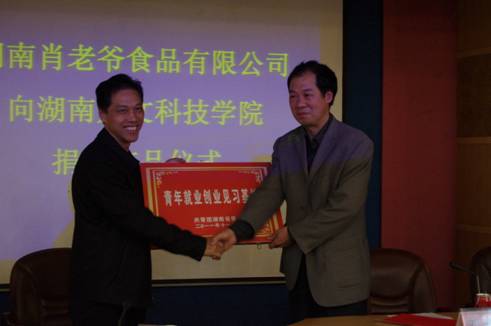 刘铁铭代表学校授予湖南肖老爷食品有限公司为beat365青年就业创业见习基地并讲话,他衷心的感谢湖南肖老爷食品有限公司的捐赠,希望同学们努力学习,为以后奉献社会奠定基础。