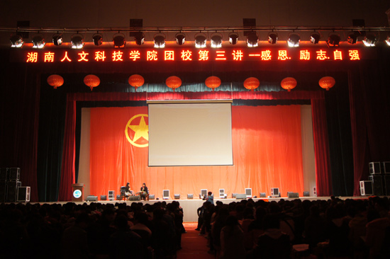 2011年11月26日晚7:30,主题为“感恩·励志·自强”的团校第六期培训班第三讲在体育馆隆重举行。2010年度中国大学生自强之星李玉花受邀做客团校大讲坛。