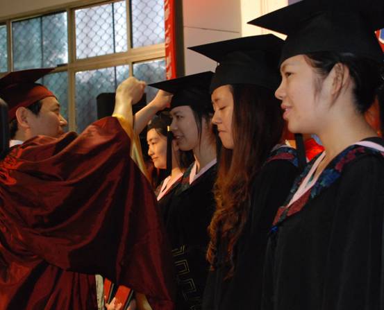 郭校长为50名毕业生代表颁发了毕业证书、学位证书,并为他们正冠、拔苏。