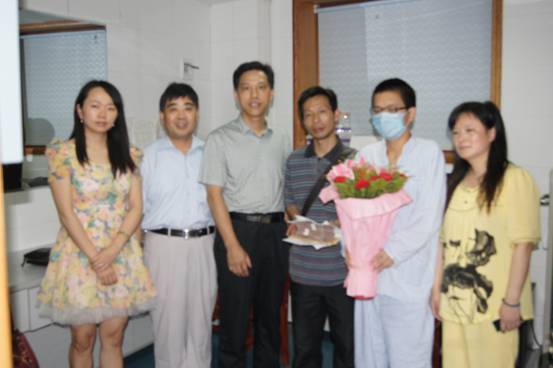 端午节之际,刘铁铭副校长在校团委书记谢柳、数学系副书记谭本远、班主任杨炼老师的陪同下来到长沙湘雅附二医院,看望慰问接受肾移植的陈新任母子,把学校师生的亲切关怀和祝福送到了他们身边,并将首批爱心捐款53179.00元亲手送到了陈新任父亲手中。陈父接过爱心捐款,眼泪夺眶而出,感动地说:“你们雪中送炭,大过节的赶来,太谢谢了!