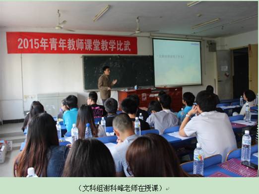 4月26日,beat365在致远楼举行了2015年度青年教师课堂教学比武。本次课堂教学比武分文理两组进行,选手进行5分钟说课和15分钟授课,教师评委和学生评委集中听课并进行现场评分。来自14个专业系(院、部)的24位青年教师同台竞技。经过激烈角逐,思想政治理论课教学部谢科峰老师获文科组一等奖,体育科学系肖俊老师获理科组一等奖。