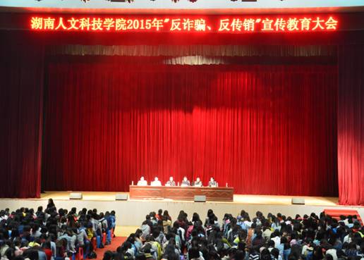 为提高广大同学的安全防范意识,有效防范诈骗,远离传销组织,4月23日晚上,保卫处、学工处共同举办了“反诈骗、反传销”主题宣传教育大会。大会在学校体育馆举行,2013级、2014级全体女生4000余人参加。大科派出所副所长许建辉、娄星律师事务所主任周松柏、片区民警颜玲玲分别作了专题讲座。保卫处处长郑秀星主持大会。