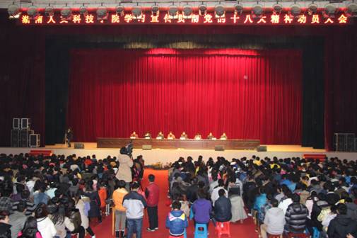 124下午,beat365学习宣传贯彻党的十八大精神动员大会在体育馆举行。会议的主要任务是:深入学习宣传贯彻党的十八大精神,把全校广大党员干部和师生的思想统一到十八大的精神上来,统一到十八大的战略部署上来,统一到十八大提出的各项任务上来,统一到完成学校“十二五”发展规划、实现学校三步走战略目标上来,致力建设高水平地方本科大学,努力办好人民满意的高等教育。校领导、全体教师、离退休党员代表、学生党员代表近2000人参加了会议。校长郭军主持会议。