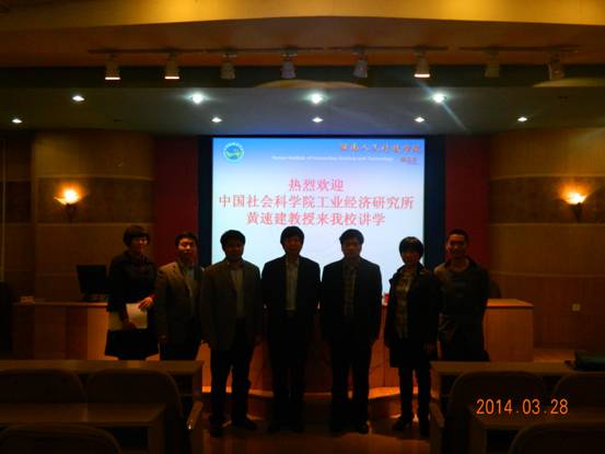 3日28日下午,中国社会科学院工业经济研究所副所长黄速建研究员应邀在养根楼多媒体报告厅为经管系师生做了题为“企业环境变迁与转型升级”的讲座。讲座由周发明副校长主持,经管系部分师生聆听了报告。