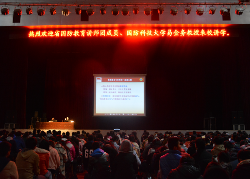 3月9日晚,省国防教育讲师团成员、国防科技大学教授易金务应邀以“中国周边安全最新态势及对策”为题,在学校体育馆作专题讲座。校军事爱好者协会、民兵信息分队、后勤勤务保障分队及来自各学院的2000余名学生参加。讲座由校长助理谢贵辉主持。