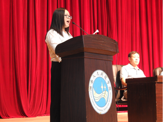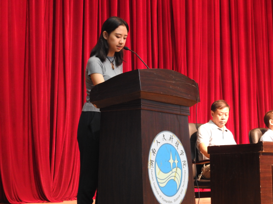 音乐舞蹈学院梁娟华代表老生发言。她说,境由心造,我们要把普通学校读成名校,在人群中发光发热。要战胜自我,超越自我,追求理想,成长成才。