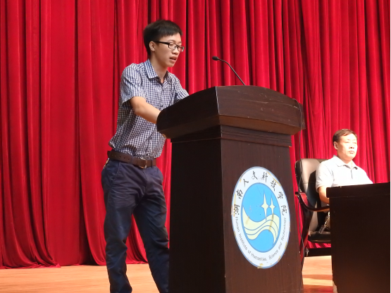 2016级农业专业研究生袁愈明代表研究生新生发言。他说,我们因为对知识的渴望走到了一起,让我们不忘初心,肩负起历史责任,为建设富强中国美丽中国而奋斗。